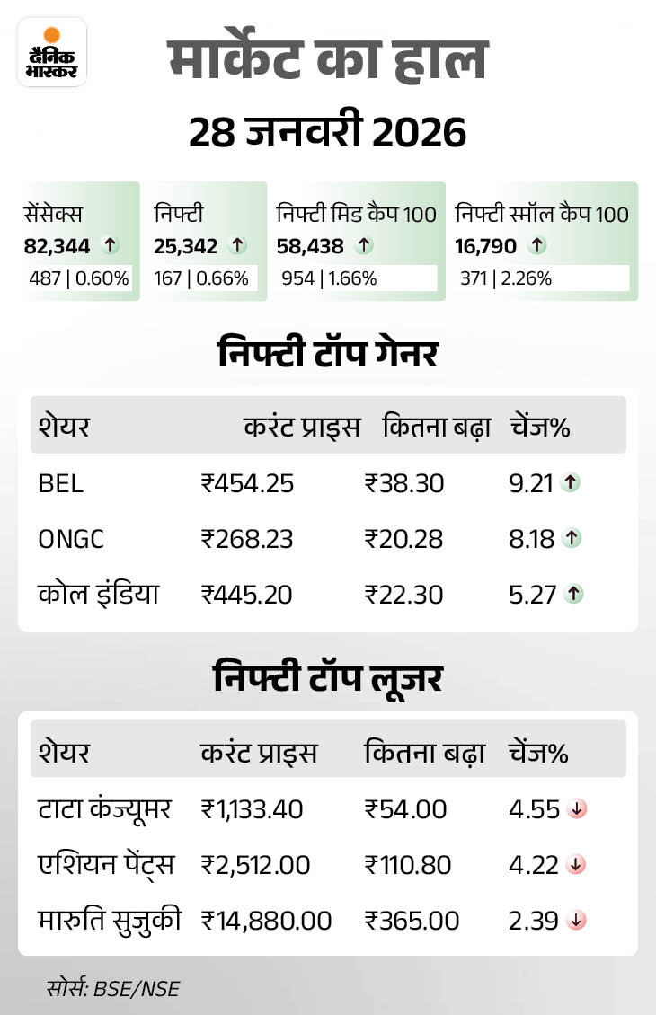 कल बाजार में रही थी तेजी इससे पहले कल यानी 28 जनवरी को शेयर बाजार में तेजी रही थी। सेंसेक्स 487 अंक चढ़कर 82,344 के स्तर पर बंद हुआ था। निफ्टी भी 167 अंक चढ़ा, ये 25,342 के स्तर पर बंद हुआ था।