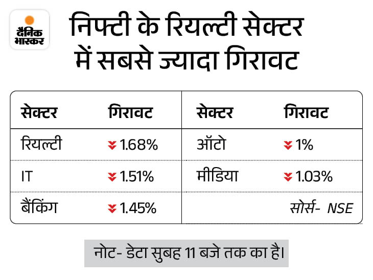 वहीं निफ्टी में भी करीब 200 (0.80%) अंक की गिरावट है। ये 25,000 के स्तर पर कारोबार कर रहा है। सेंसेक्स के 30 शेयरों में से 5 में तेजी और 25 में गिरावट है। बैंकिंग, ऑटो, रियल्टी और IT शेयर्स में सबसे ज्यादा बिकवाली है।