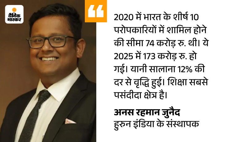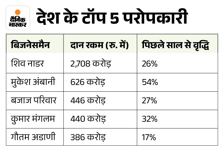 भारत की 191 धनी शख्सियतों ने पिछले साल 10,380 करोड़ रुपए दान दिए। एडलगिव-हुरुन इंडिया परोपकार सूची-2025 के मुताबिक, HCL के संस्थापक शिव नाडर एक बार फिर देश के सबसे बड़े परोपकारी रहे हैं। पिछले साल रोजाना औसतन 7.4 करोड़ रुपए दान दिए।