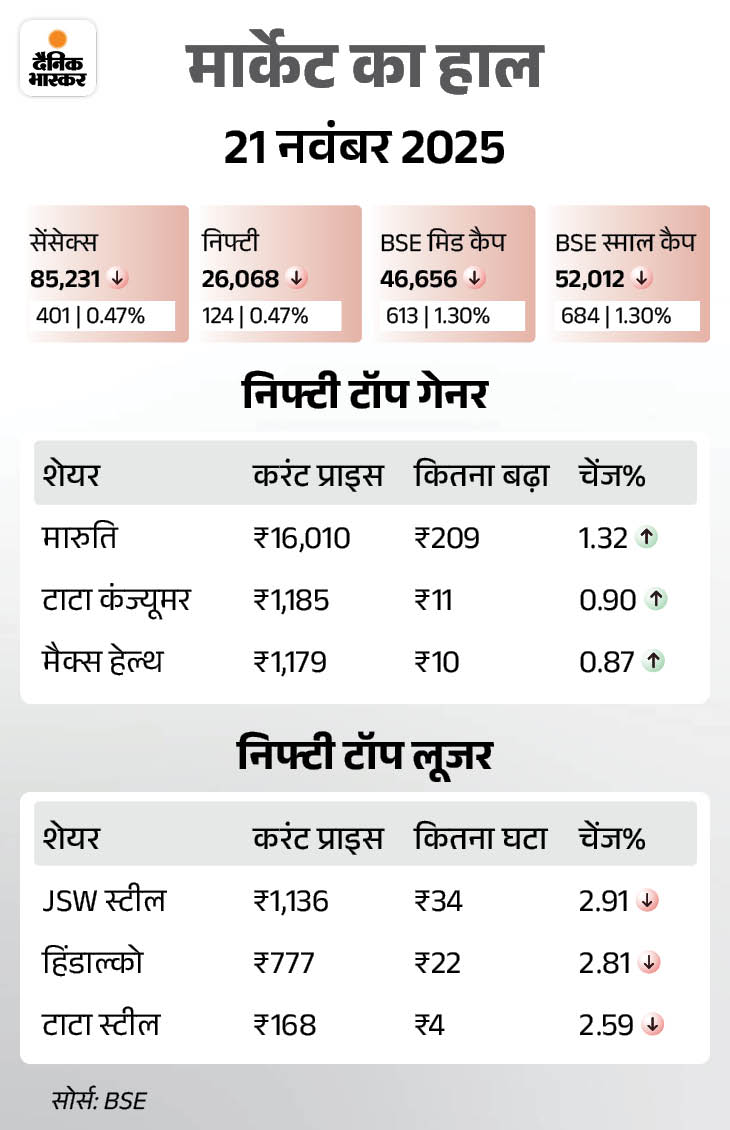 वहीं, चांदी की कीमत आज 2,984 रुपए गिरकर 1,51,129 रुपए प्रति किलोग्राम हो गई है। कल यह 1,54,113 रुपए प्रति किलोग्राम थी। 17 अक्टूबर को सोने ने 1,30,874 रुपए और 14 अक्टूबर को चांदी ने 1,78,100 रुपए का ऑल टाइम हाई बनाया था।
