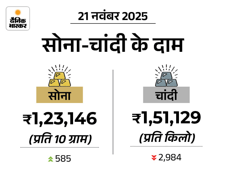 21 नवंबर को सोने के दाम में तेजी और चांदी के दाम में गिरावट रही। इंडिया बुलियन एंड ज्वेलर्स एसोसिएशन (IBJA) के अनुसार 10 ग्राम सोने का दाम 585 रुपए चढ़कर 1,23,146 रुपए पर आ गया। इससे पहले इसकी कीमत 1,22,561 रुपए प्रति 10 ग्राम थी।