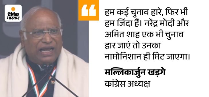 कांग्रेस के राष्ट्रीय अध्यक्ष मल्लिकार्जुन खड़गे ने कहा कि मेरे बेटे का आठ घंटे का ऑपरेशन होना था। मुझे घर से भी फोन आया कि आपको आना चाहिए, लेकिन जब देश के लिए जवान मर रहे हैं, इंदिरा-राजीव ने कुर्बानी दी, सोनिया ने सबकुछ त्याग दिया। मैं अपने बेटे के लिए इस लड़ाई को छोड़कर नहीं जा सकता। बेटे को कुछ भी हुआ कोई बात नहीं, मगर देश के लोगों को कुछ नहीं होना चाहिए। हमें पीछे नहीं हटना है, पीछे हट जाएंगे तो मर जाएंगे।