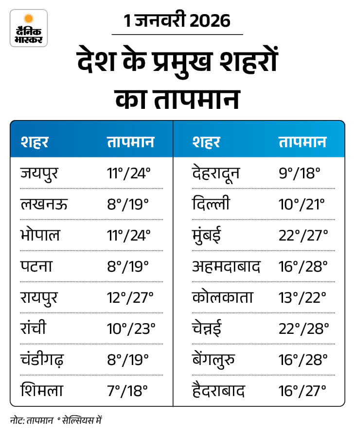 - पंजाब, हरियाणा, उत्तर प्रदेश, राजस्थान, बिहार, मध्य प्रदेश, झारखंड, छत्तीसगढ़ में घने कोहरे का अलर्ट।