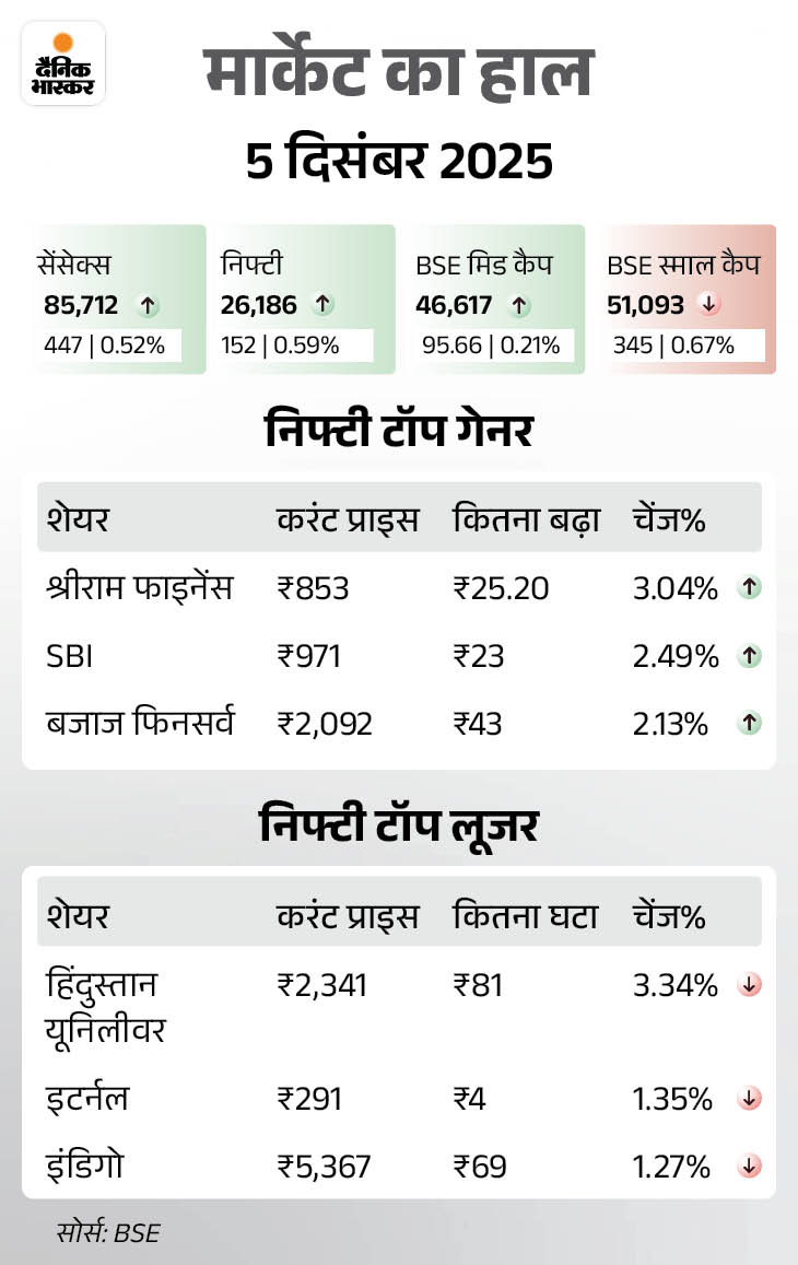 शुक्रवार, 5 दिसंबर को सेंसेक्स 447 अंक चढ़कर 85,712 पर बंद हुआ। निफ्टी में भी 152 अंक की तेजी रही, ये 26,186 पर बंद हुआ था। वहीं, SBI और बजाज फिनसर्व के शेयरों में भी उछाल गया है।