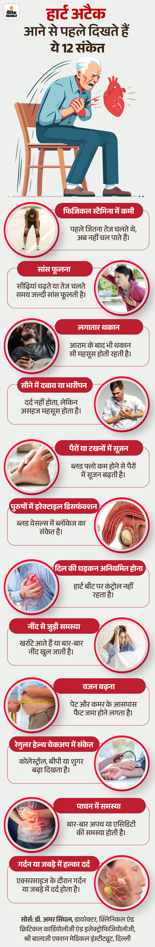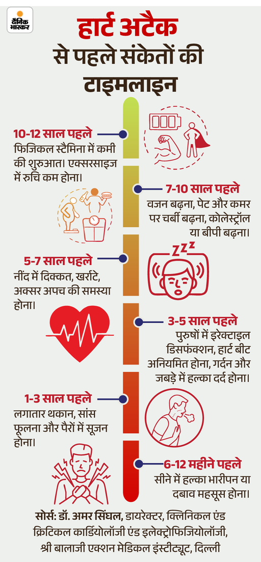 हार्ट अटैक अचानक नहीं आता। सालों पहले शरीर में छोटे-छोटे बदलाव दिखने लगते हैं। ये संकेत अगर समय पर समझ लिए जाएं तो डॉक्टर की मदद से बड़ा खतरा टाला जा सकता है। स्टडीज बताती हैं कि ये क्लू 10-12 साल पहले से शुरू हो सकते हैं। लेकिन ज्यादातर लोग इन्हें थकान या उम्र समझ लेते हैं। यहां 12 ऐसे संकेत हैं जो दिल की समस्या का इशारा दे सकते हैं।