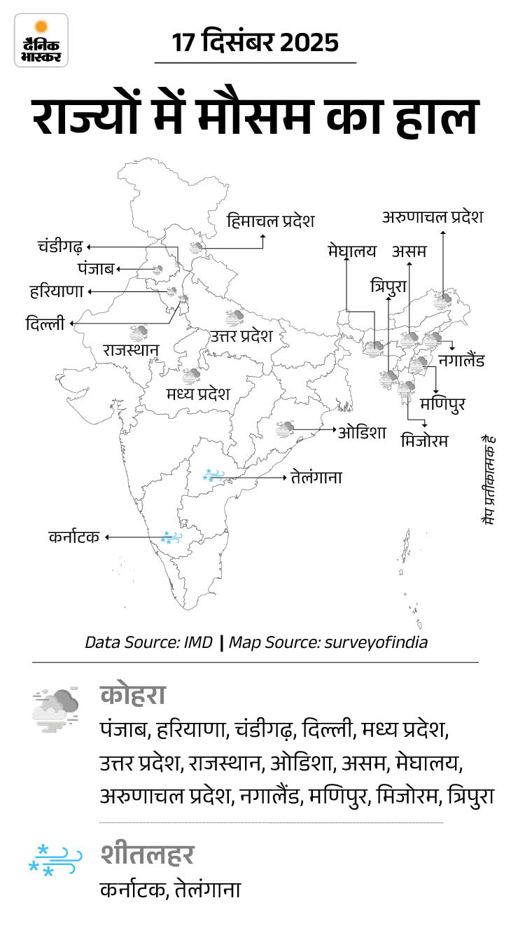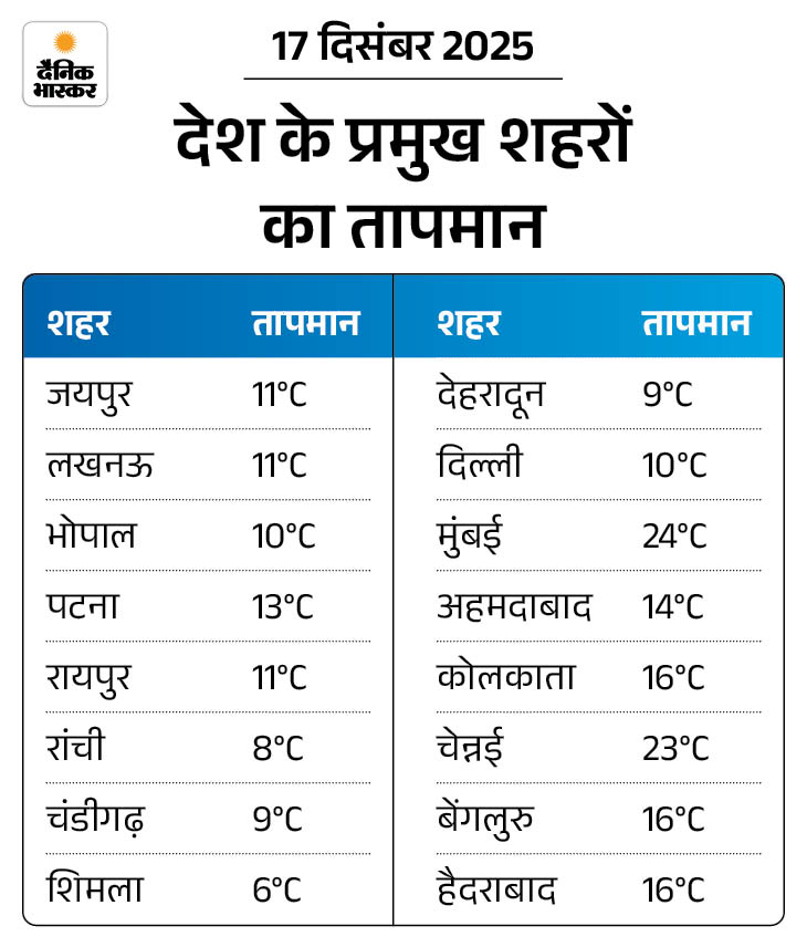मंगलवार को मध्य प्रदेश में भोपाल सबसे ज्यादा ठंडा रहा। यहां तापमान 4.5°C रिकॉर्ड किया गया, जो इस सीजन का सबसे कम तापमान रहा। इधर, राजस्थान के ज्यादातर जिलों में मिनिमम तापमान 10°C से नीचे दर्ज किया गया है। श्रीगंगानगर में कोहरे के कारण विजिविलिटी 10 मीटर से भी कम रही।