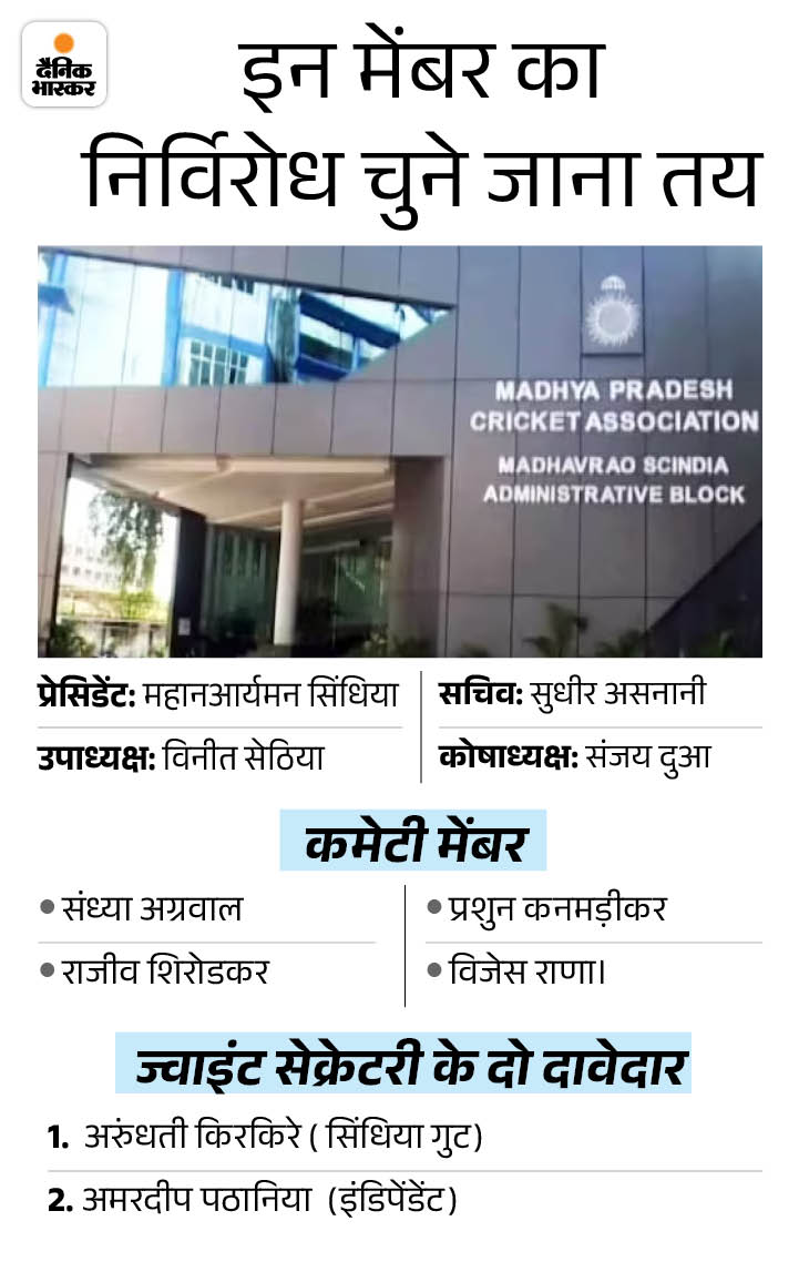 नई कार्यकारिणी का चुनाव 2 सितंबर को होना है। 30 अगस्त तक नामांकन की अंतिम तिथि थी। नई कार्यकारिणी मंगलवार को एमपीसीए की एजीएम में तीन साल के लिए चुन ली जाएगी। इसमें शामिल होने के लिए ज्योतिरादित्य सिंधिया और महानआर्यमन 1 सितंबर को इंदौर पहुंच जाएंगे।