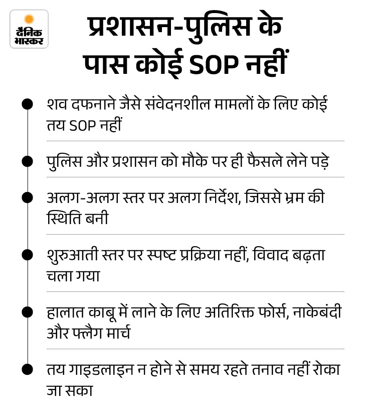 यही वो गांव है, जहां एक शव दफनाने से शुरू हुआ विवाद अब हिंसा, पथराव और आगजनी तक पहुंच चुका है। बड़े तेवड़ा गांव पूरी तरह सूना दिखाई देता है। घरों के बाहर सिर्फ मवेशी नजर आते हैं। गलियों में सन्नाटा है और हर तरफ केवल सुरक्षाबल और पुलिस के जवान तैनात हैं।