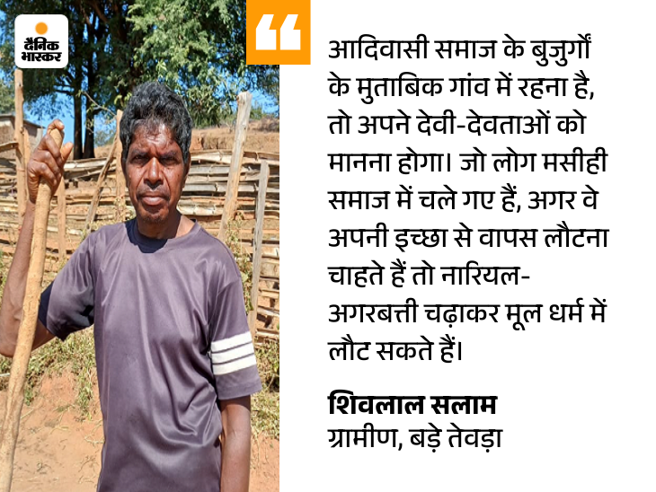 सरपंच के घर से थोड़ी दूरी पर ही एक बाड़ी में काम करते शिवलाल सलाम मिलते हैं। वे बताते हैं कि वे भी इसी परिवार से हैं, लेकिन अब अलग रहते हैं। शिवलाल कहते हैं कि उन्होंने ईसाई धर्म अपनाया है, लेकिन इस विवाद में वे गांव के उस पक्ष में खड़े थे, जो शव दफनाने का विरोध कर रहा था।