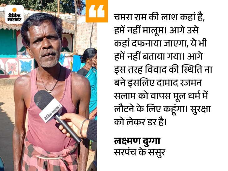 लक्ष्मण का कहना है कि यहीं से विवाद और बढ़ता चला गया। दो दिन बाद प्रशासन ने कब्र खोदकर शव को बाहर निकाला और पोस्टमॉर्टम के लिए भेज दिया। फिर हिंसा और चर्च में तोड़फोड़ हुई। मैं तो आदिवासी देव को मानने वाला हूं लेकिन रजमन का ससुर होने की वजह से परिवार की सुरक्षा को लेकर डर है।