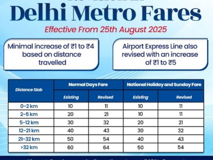 12-21 किमी की यात्रा के लिए अब ₹30 की बजाय ₹32 देने होंगे, और 21-32 किमी की दूरी के लिए किराया ₹40 से बढ़ाकर ₹43 कर दिया गया है। 32 किमी से अधिक लंबी दूरी के लिए, किराया ₹50 से बढ़ाकर ₹54 कर दिया गया है।