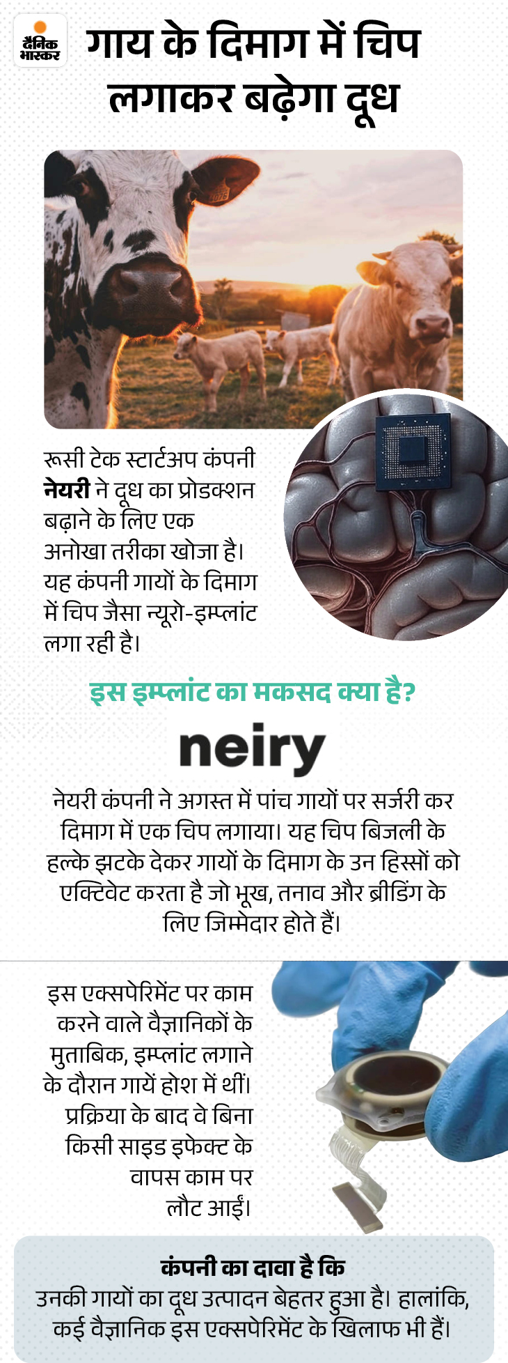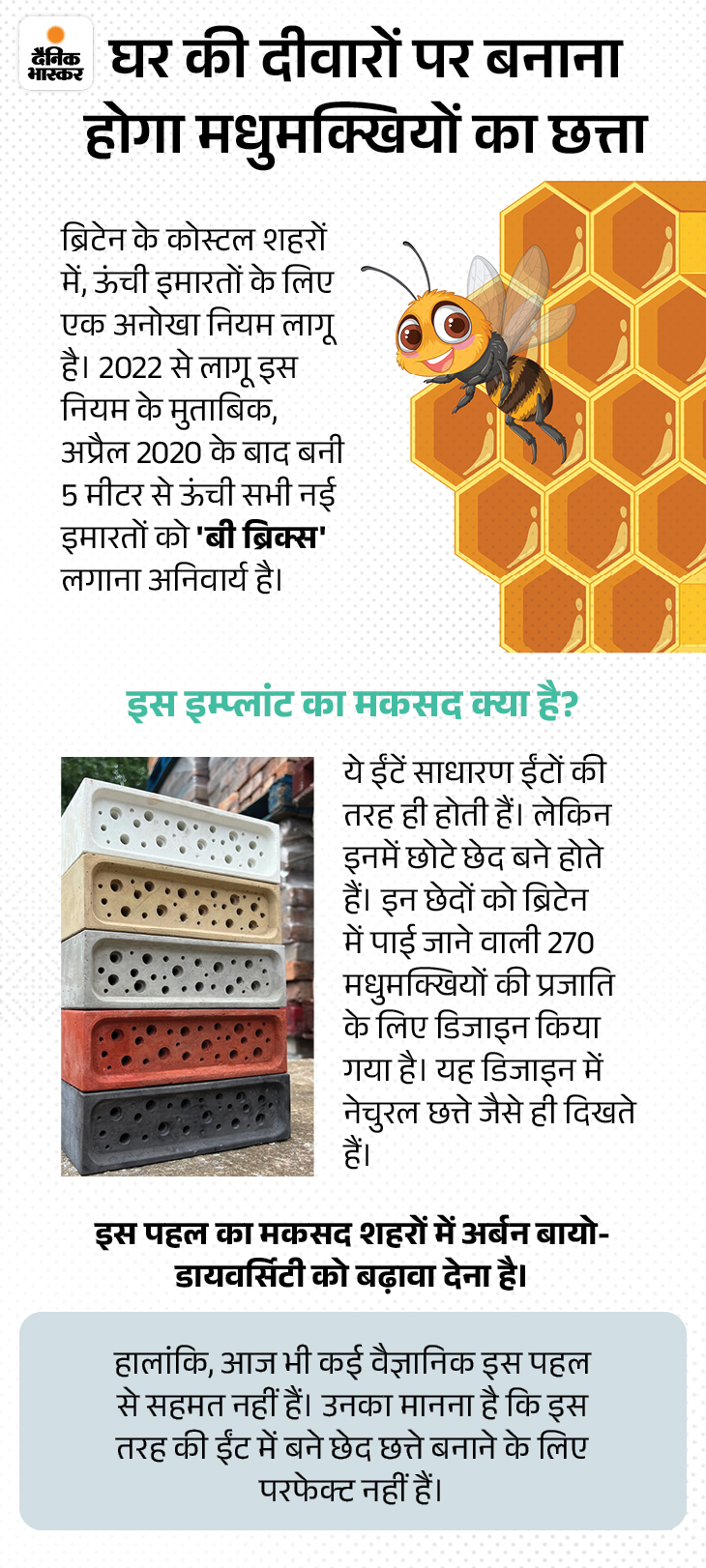 इन दिनों रूसी वैज्ञानिक गाय के दिमाग में सर्जरी कर चिप लगा रहे हैं। इसके लिए 5 गायों पर टेस्टिंग भी हो चुकी है। वहीं ब्रिटेन में घरों की दीवारों पर मधुमक्खियों के लिए छत्ते बनाने का एक नियम है।