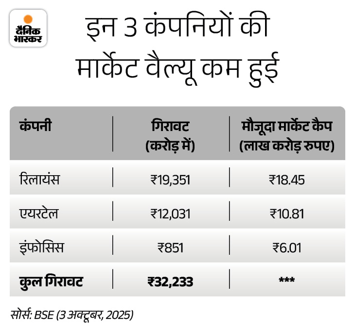 SBI का मार्केट कैप 9,277 करोड़ रुपए बढ़कर ₹8 लाख करोड़ पर पहुंच गई। वहीं, देश की सबसे बड़ी कंपनी रिलायंस इंडस्ट्रीज लिमिटेड का मार्केट कैप 19,351 करोड़ रुपए गिरकर ₹18.45 लाख करोड़ पर आ गया है। इसके अलावा, एयरटेल और इंफोसिस की वैल्यू भी गिरी है।