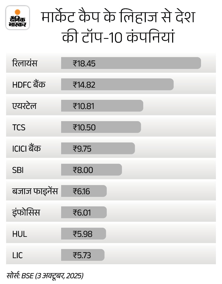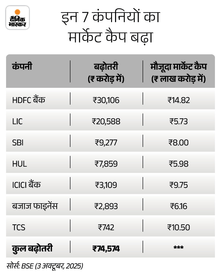 टॉप-10 कंपनियों में 7 की वैल्यू ₹74,574 करोड़ बढ़ी: HDFC बैंक टॉप गेनर रहा; रिलायंस का मार्केट कैप ₹19,351 करोड़ गिरकर ₹18.45 लाख करोड़ हुआ