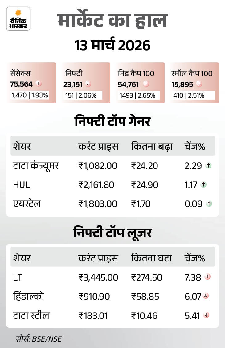 अमेरिका-इजराइल और ईरान जंग के बीच पिछले हफ्ते सेंसेक्स 4,354.98 (5.51%) और निफ्टी 1,299.35 (5.31) अंक गिरा था। वहीं शुक्रवार 13 मार्च को लगातार तीसरे दिन गिरावट रही थी।