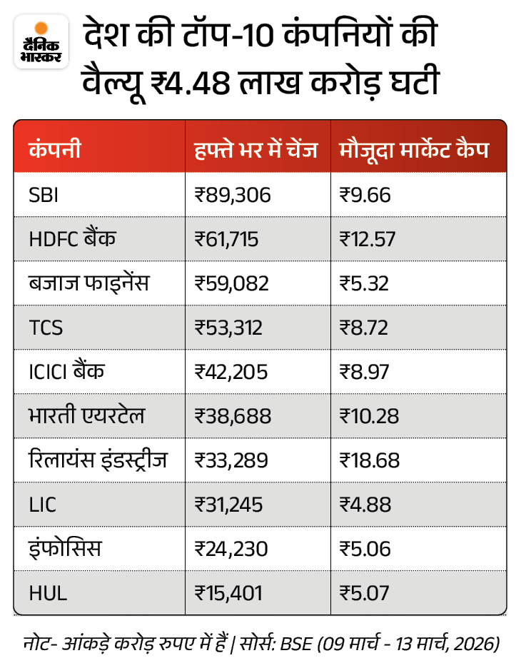 मार्केट कैपिटलाइजेशन के लिहाज से देश की 10 सबसे बड़ी कंपनियों की वैल्यू बीते हफ्ते के कारोबार में 4.48 लाख करोड़ रुपए घट गई। इस दौरान SBI की वैल्यू सबसे ज्यादा घटी। SBI का मार्केट कैप 89,306 करोड़ रुपए घटकर ₹9.66 लाख करोड़ पर आ गया।
