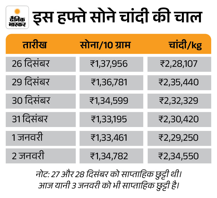 इस हफ्ते सोने के दाम में गिरावट रही। सोना 3,174 रुपए गिरकर 1,34,782 प्रति 10 ग्राम पर आ गया है। इससे पहले ये बीते हफ्ते यानी 26 दिसंबर, शुक्रवार को 1,37,956 रुपए पर था।