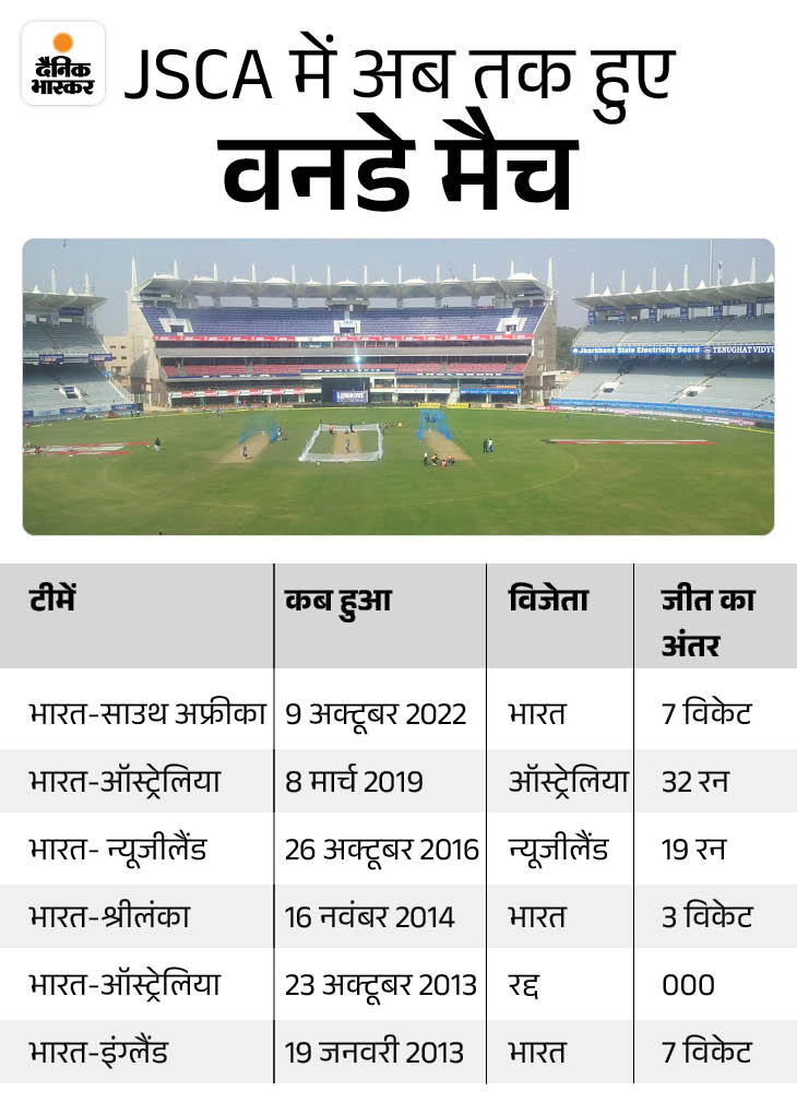 रांची के जेएससीए स्टेडियम में आज भारत और दक्षिण अफ्रीका के बीच वनडे मुकाबला खेला जाएगा। मैच दोपहर 1:30 बजे शुरू होगा, जबकि दोनों टीमें दोपहर 12 बजे तक स्टेडियम पहुंच जाएंगी।
