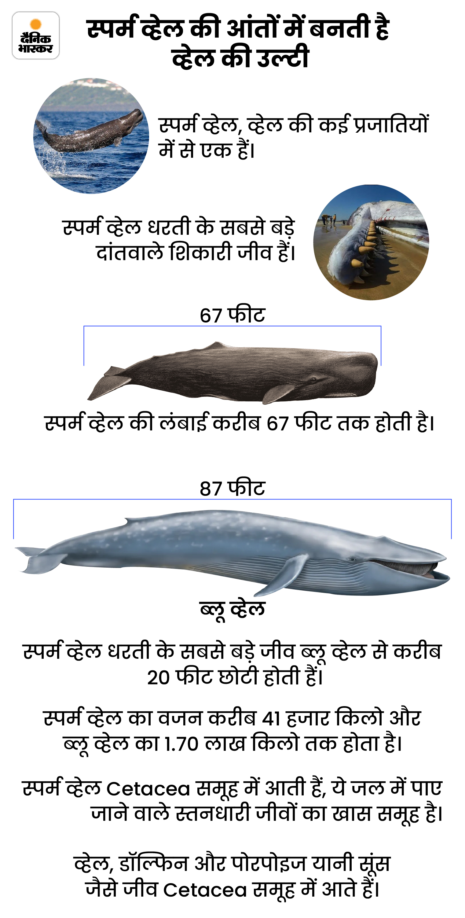 जवाब: व्हेल की उल्टी या एम्बरग्रीस फ्रेंच शब्द एम्बर और ग्रीस से मिलकर बना है, जिसका मतलब होता है ग्रे एम्बर। इसे व्हेल की उल्टी कहा जाता है। यह कठोर मोम की तरह होती है, जो स्पर्म व्हेल के पाचन तंत्र में मौजूद आंतों में बनती है।