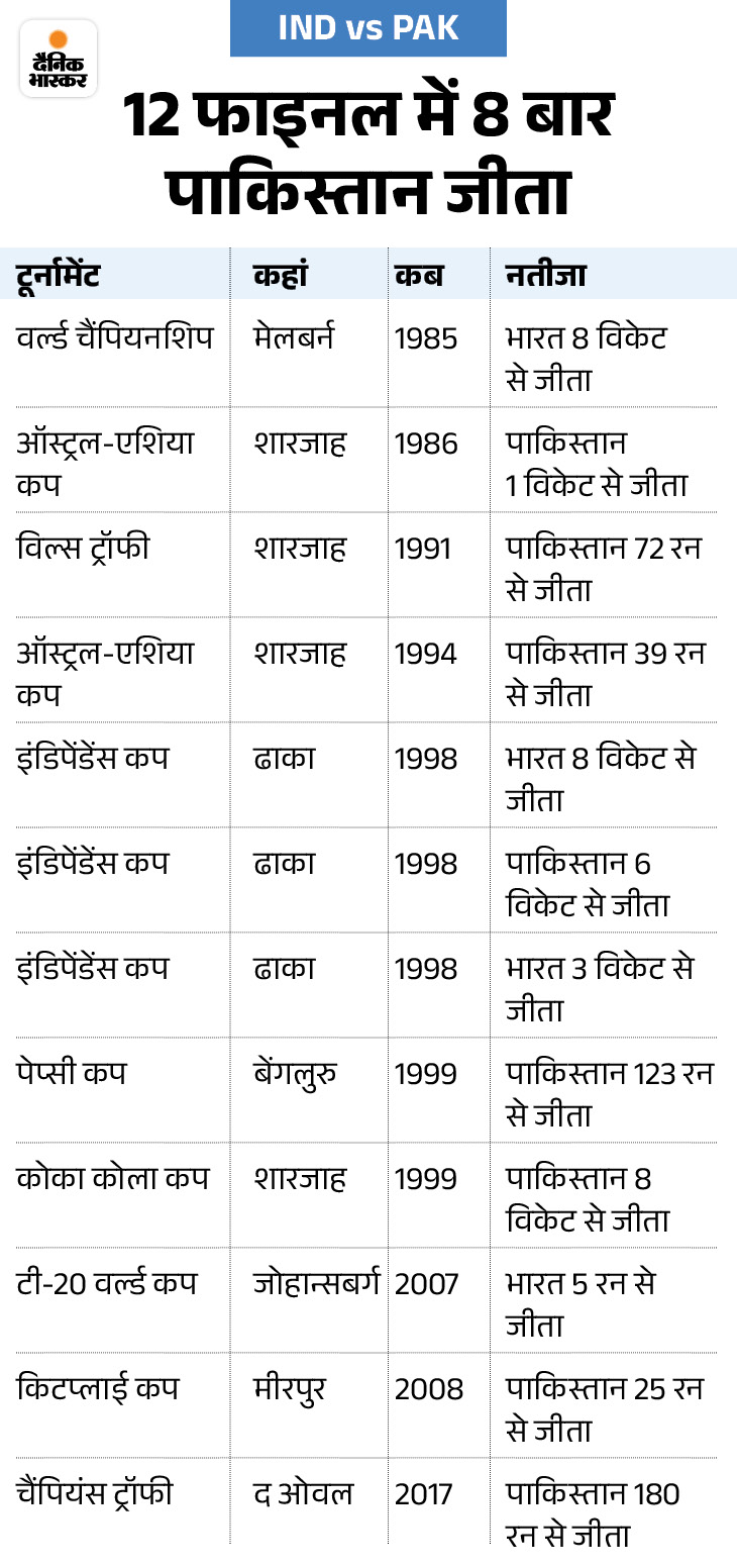 फाइनल की भिड़ंत का हिसाब-किताब भारत और पाकिस्तान की टीमें इससे पहले कुल 10 टूर्नामेंट में 12 बार फाइनल में आमने-सामने हो चुकी हैं। 8 बार पाकिस्तान जीता और 4 बार भारतीय टीम कामयाब रही। इन सभी मैचों के नतीजे आगे देख सकते हैं।
